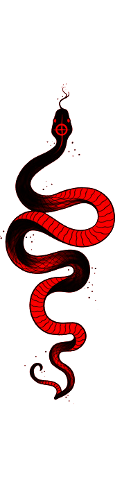 One tattoo from the base of the neck, covering whole back and ass (serpent & flowers). On his left pinky, he has a ring-like, bright red mark (that often gets confused for a tattoo). A red mark (scar) crossing the bridge of his nose.DISTINGUISHED FEATURES